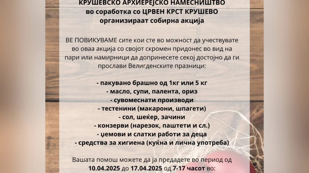 Во соработка со МАКЕДОНСКА ПРАВОСЛАВНА ЦРКВА – ОА КРУШЕВСКО АРХИЕРЕЈСКО НАМЕСНИШТВО организираме собирна акција за Велигден.